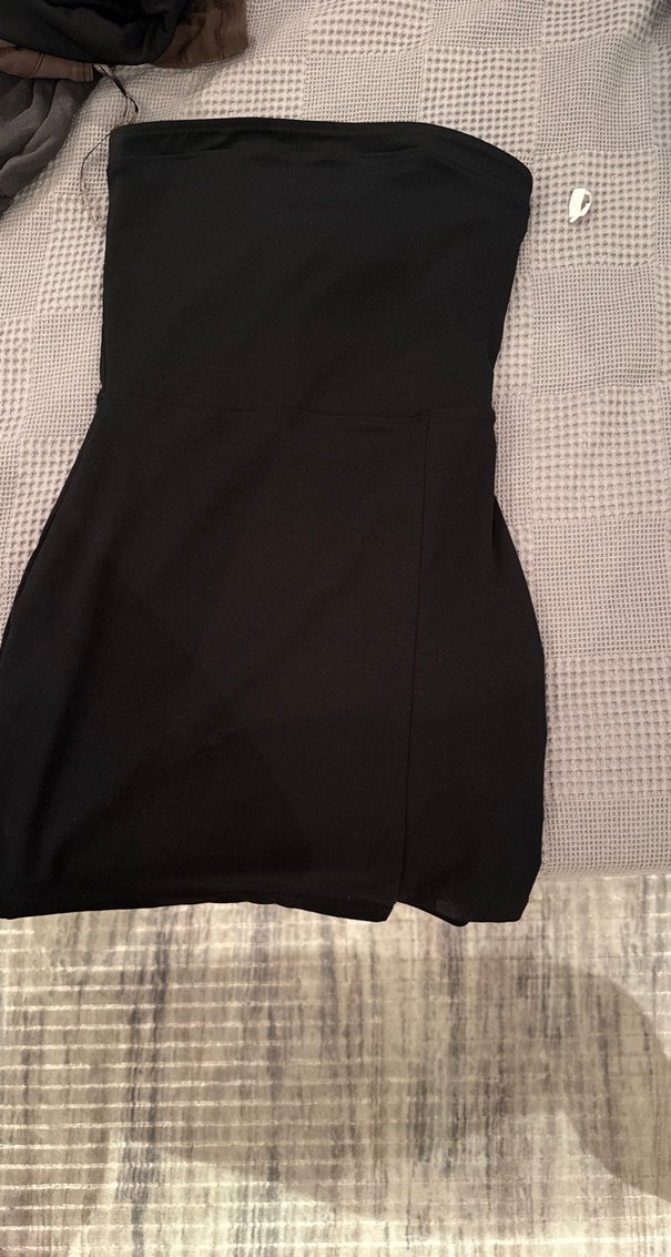 Siyah, drapeli, midi uzunlukta, tek parça abiye elbise, kayık yaka ve kolsuz tasarıma sahip, minimalist gotik tarz için uygun.