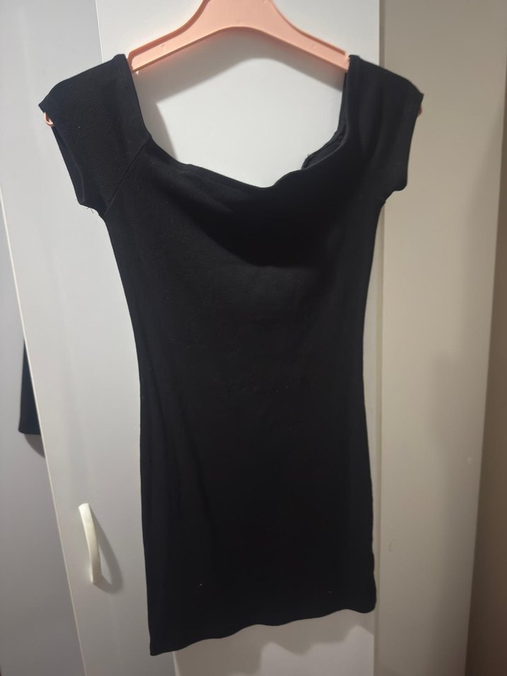 Siyah midi elbise, tek parça ve dar kesimdir. Kayık yaka ve drapeli detaylıdır, kolsuz ve sentetik kumaştan üretilmiştir. Minimalist gotik tarzda cesur günlük kullanıma uygundur.