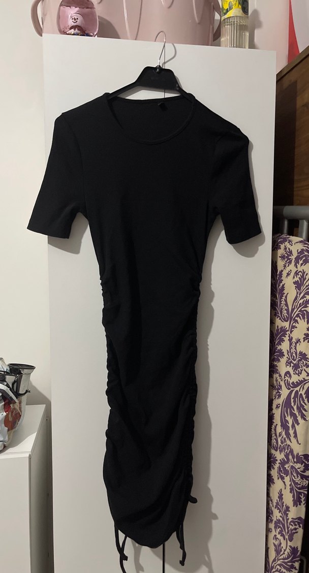 Siyah, kısa kollu, bisiklet yaka ve drapeli detaylara sahip midi boy, vücuda oturan kadın elbisesi. Rahat sentetik kumaştan, minimalist sokak stili için uygundur.