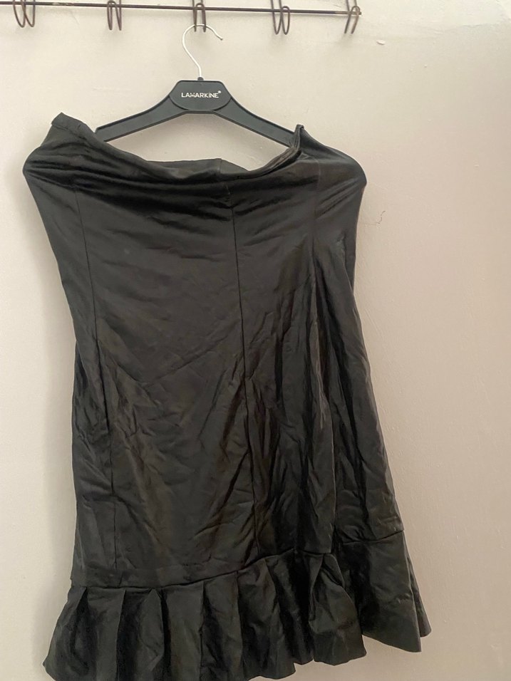 Siyah drapeli, midi boyda, ince ve parlak kumaştan yapılmış, fit kesim kadın eelbise Alt kısmı hafif volanlı, gotik stil için uygun.