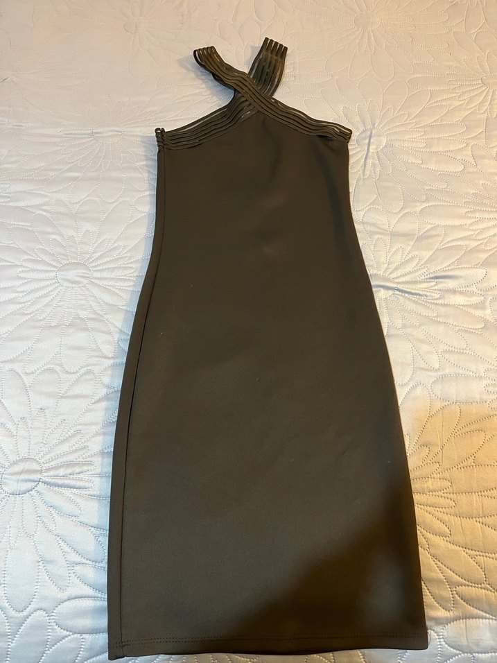 Drapeli detaylı, yüksek yakalı, kolsuz ve vücuda oturan siyah midi elbise, minimalist ve gotik tarzda, ofis için uygundur.