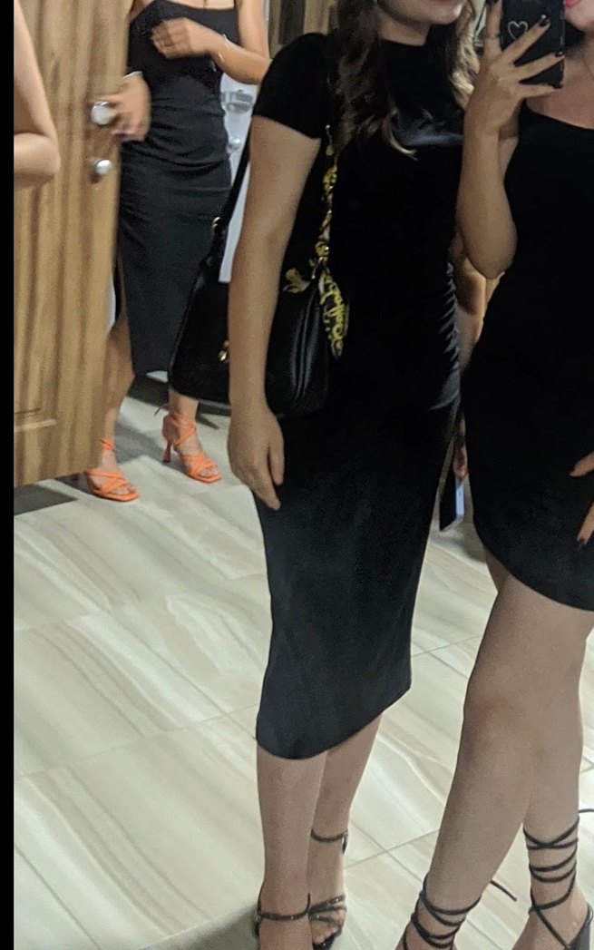 Süet kumaştan, yılan desenli, straplez ve vücuda oturan midi kalem elbise. Ofis için şık ve rahat bir tercih.