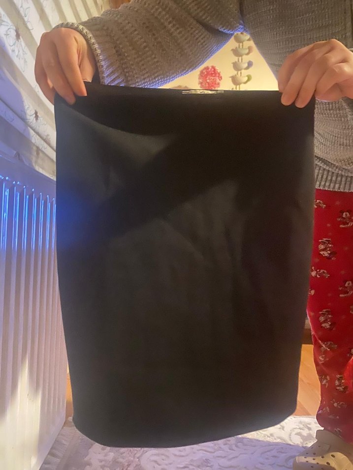 38 beden Siyah, drapeli, midi uzunlukta ve vücuda oturan bu etek, yumuşak sentetik kumaştan yapılmıştır.