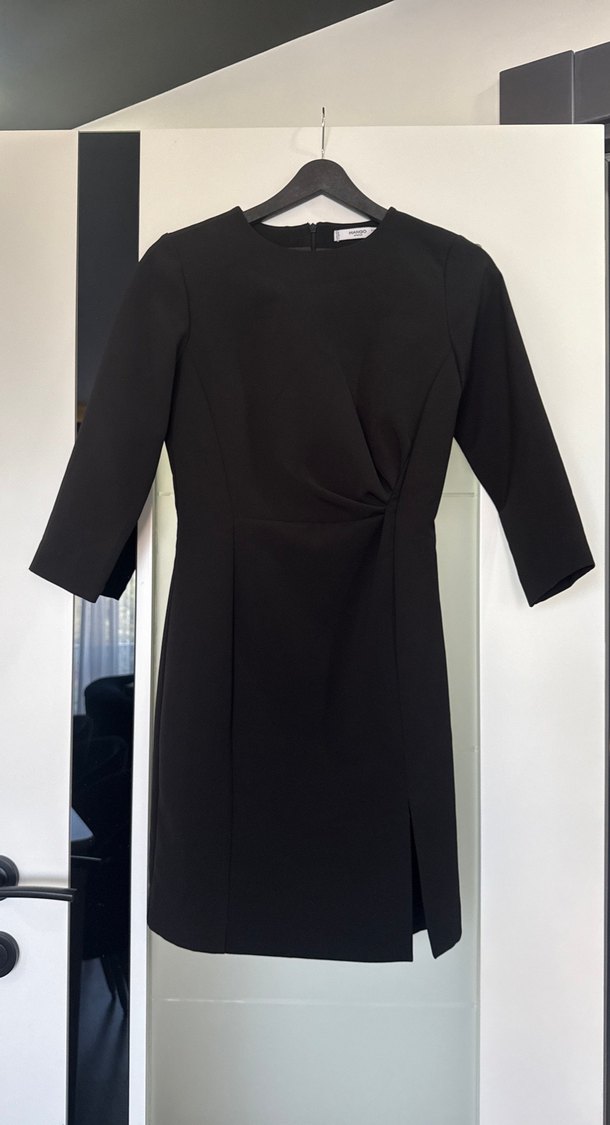 Siyah midi elbise, drapeli detay ve bisiklet yaka ile klasik ve şık bir görünüm sunar. Üç çeyrek koluyla ofis ortamına uygundur.