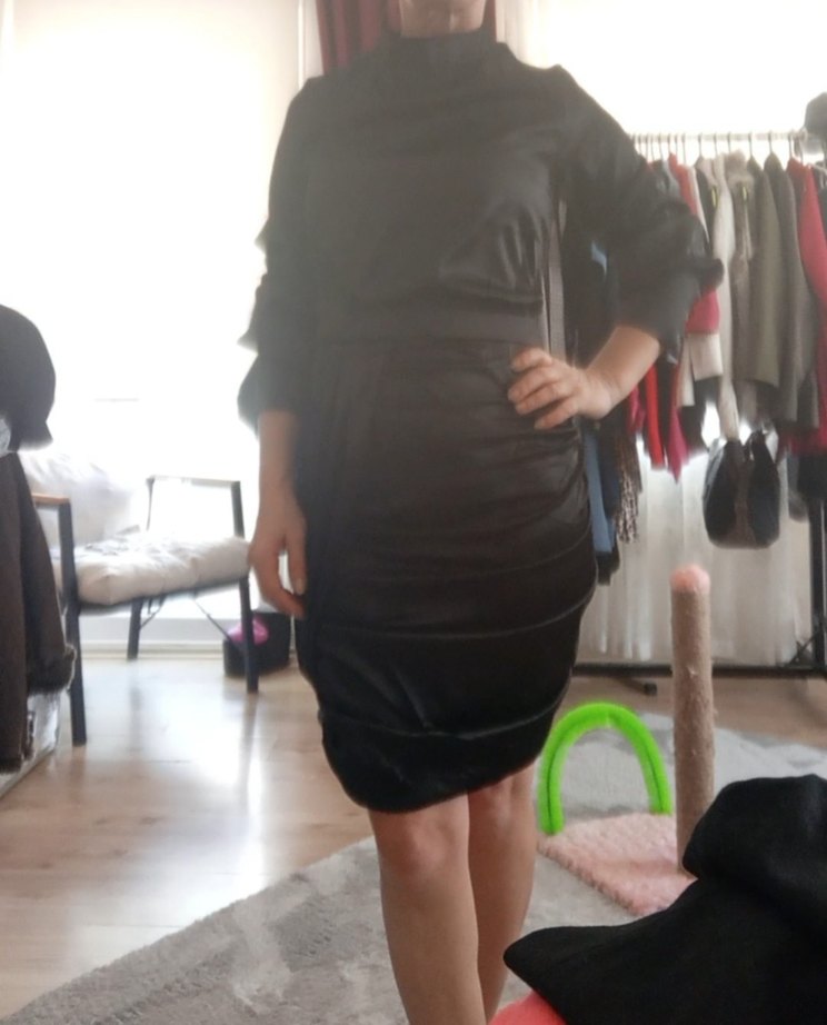 Bu siyah, drapeli, midi uzunlukta saten elbise, yüksek yakalı ve uzun kolludur. Pürüzsüz saten kumaştan olup, gotik ve avangart bir tarz sunar.