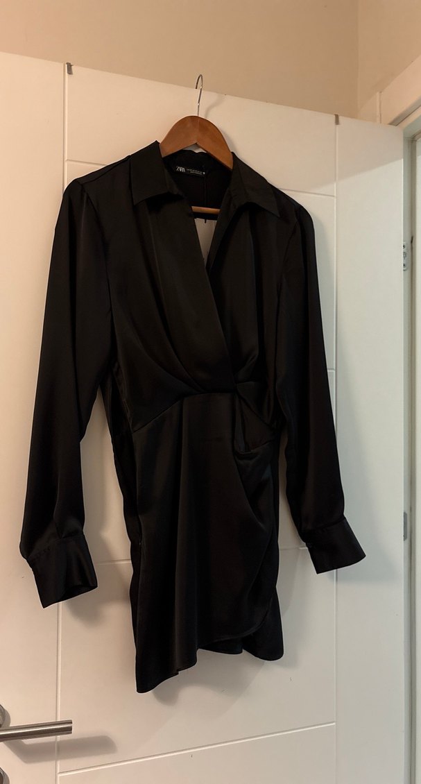Drapeli tasarıma, yakalı ve uzun kollu detaylara sahip siyah midi boy dar kesim elbise. Ofis ve resmi ortamlar için uygun, desensiz şık stil.