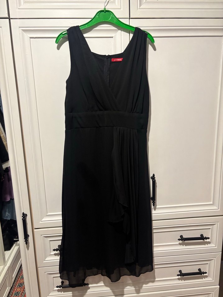 Siyah, kolsuz, V yakalı ve drapeli detaylara sahip bu midi elbise, ofis ortamı için uygundur.
