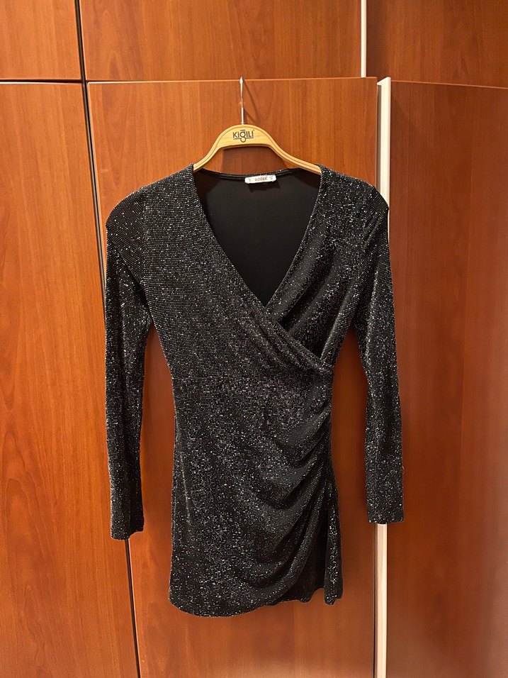 V yaka, uzun kollu, drapeli ve yılan desenli siyah mini abiye elbise, şık ve modern bir görünüm sunar. Hiç giyilmedi büyük geldiği için satıyorum