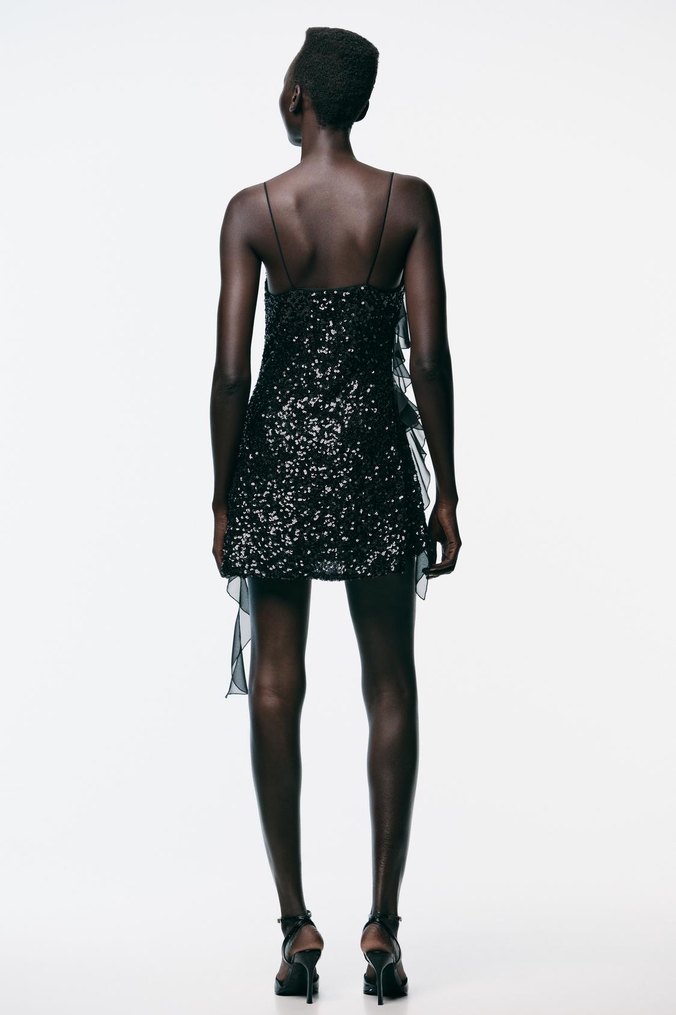 İnce askılı, drapeli tasarıma sahip siyah mini elbise, sentetik kumaştan üretilmiştir. Straplez yaka ve koyu renk, avant-garde ve goth tarzına uygundur.