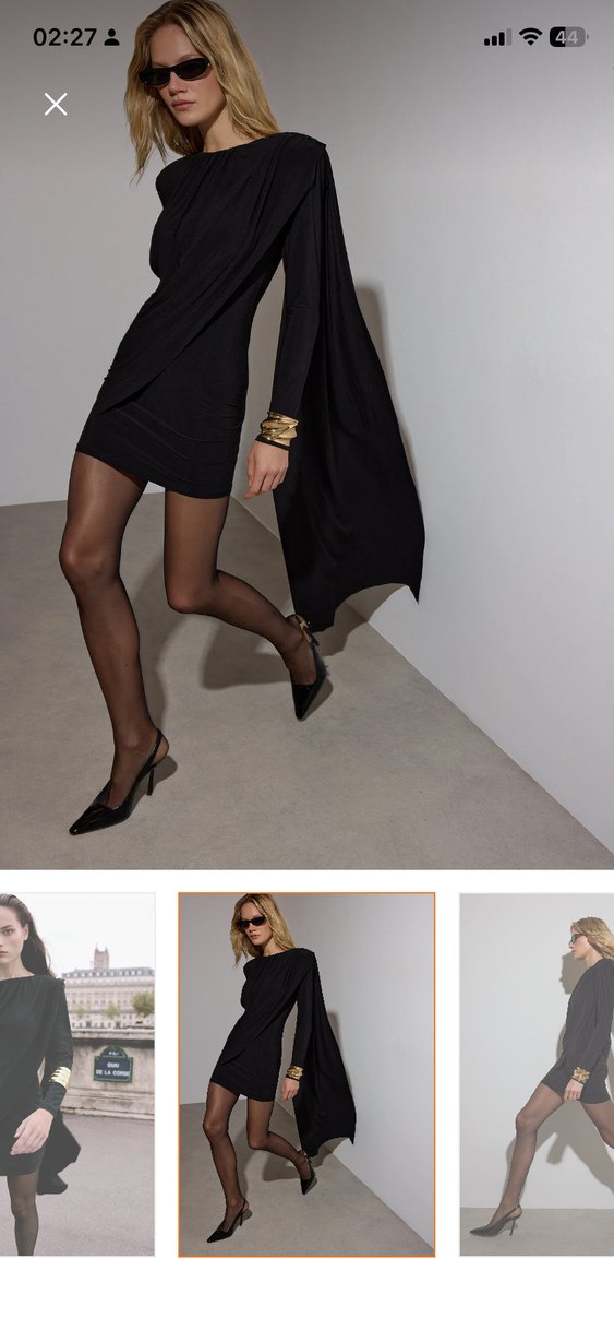 Siyah, drapeli ve askılı kısa elbise, satenimsi kumaştan. Notlu yaka detayıyla modern ve şık,