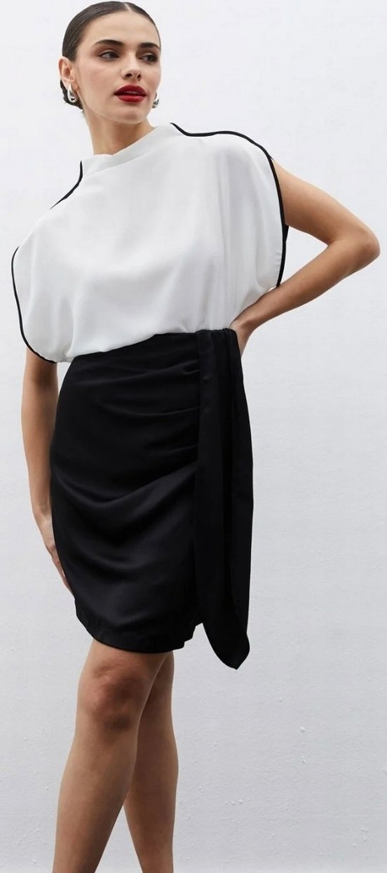 Siyah renkte, drapeli ve bol kesim mini etek. İpek gibi kumaştan üretilmiş, çağdaş ve minimal tarzda, ofis için uygun.