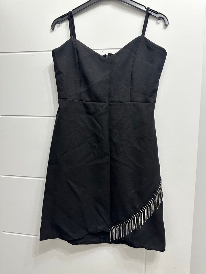 Siyah, drapeli ve nakış detaylı, askılı ve straplez kısa gece elbisesi. Oturaklı kesimi ve şık süslemeleriyle parti için uygun. ✨