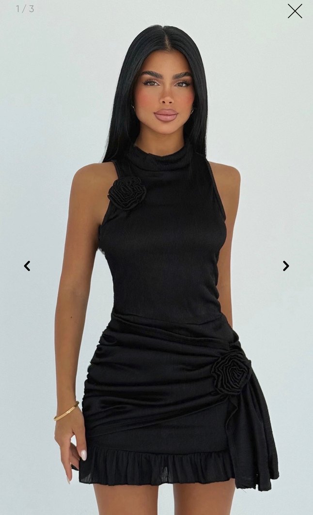Yüksek yakalı, kolsuz, drapeli ve işlemeli detaylara sahip siyah mini abiye elbise, romantik akşamlar için ideal.