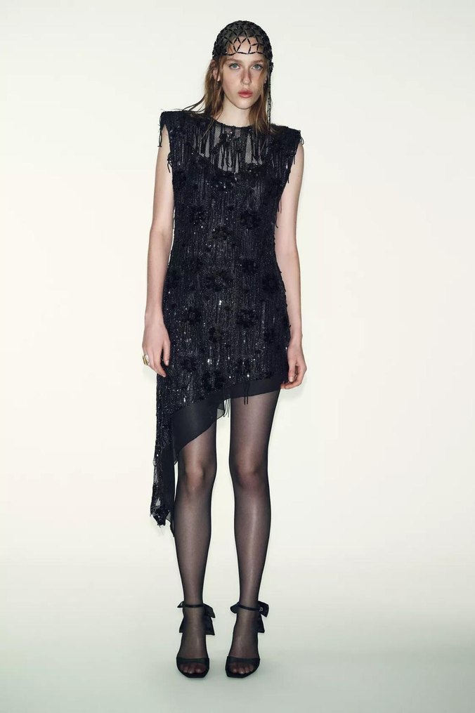Bu siyah drapeli mini abiye elbise, işlemeli desenlere sahip ve vücuda oturur. Kolsuz ve straplez yakalı, avant-garde parti tarzı için uygundur.