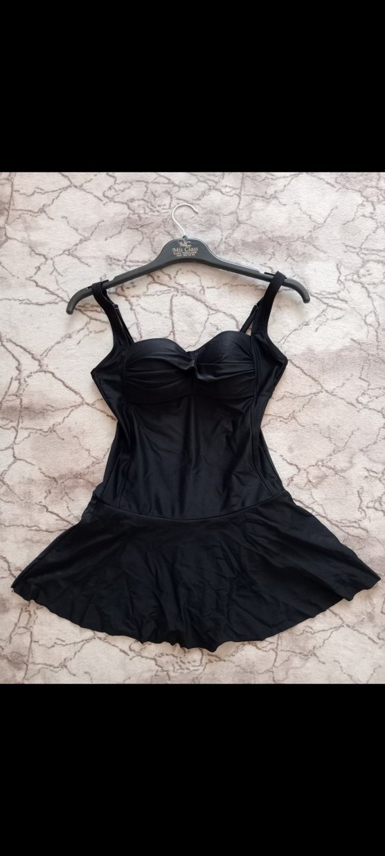 Siyah, drapeli detaylı, ince askılı, mini etek boyunda, vücuda oturan gotik tarzda kadın mayo. Cesur ve şık bir plaj tercihi.
