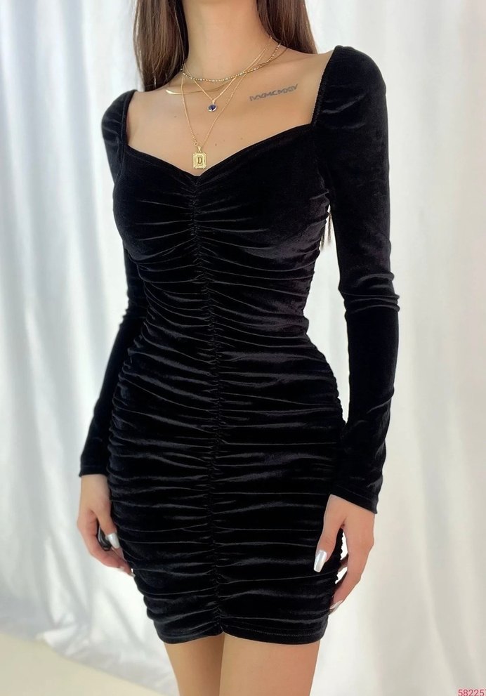 Siyah Drapeli Mini Kadife Elbise
