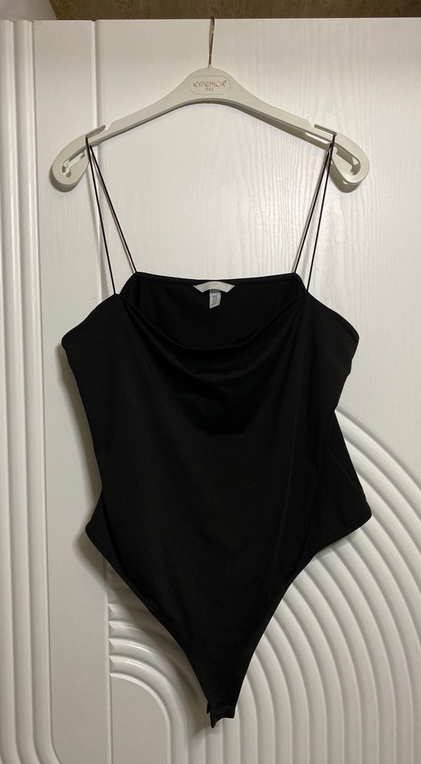 Drapeli yüksek yakalı, ince askılı, kısa kesim, siyah kadın atlet. İnce ve ipeksi dokusu ile minimal gotik tarzda şık bir parça.
