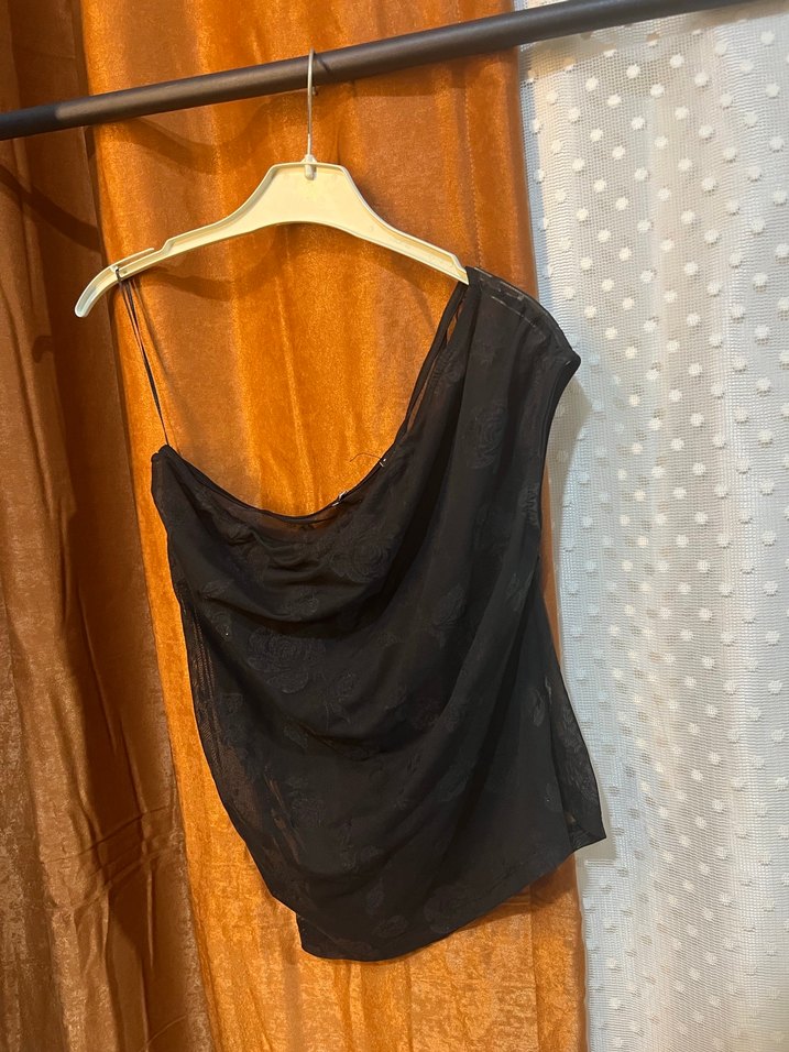 Siyah, askısız kadın bluz, drapeli yakaya ve bol kesime sahiptir. Keten kumaştan yapılmış, kısa boyu sokak stili ve minimal moda için uygundur.