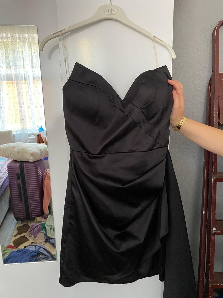 Siyah, straplez, drapeli ve vücuda oturan mini elbise, gotik tarzda romantik akşamlar için ideal. ✨ sadece bir kere giyildi 40 beden ama 38 bedene de olur