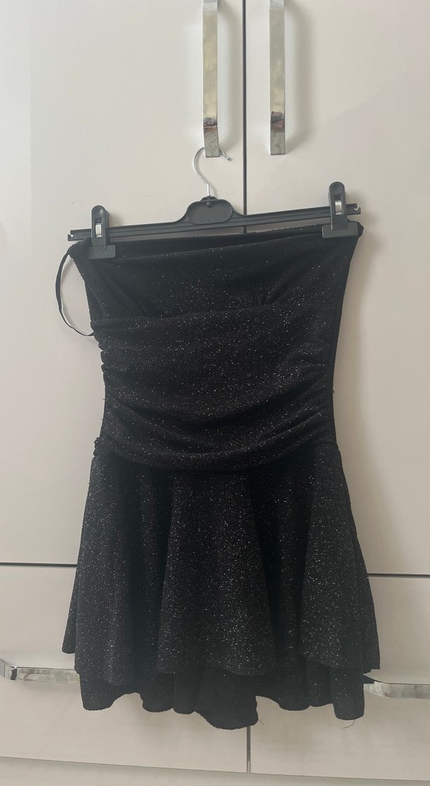 Siyah renkte, straplez yaka ve drapeli detaylara sahip, mini boy ve vücuda oturan gotik tarzda elbise. Parti için uygun, askılı kollu ve desensiz.