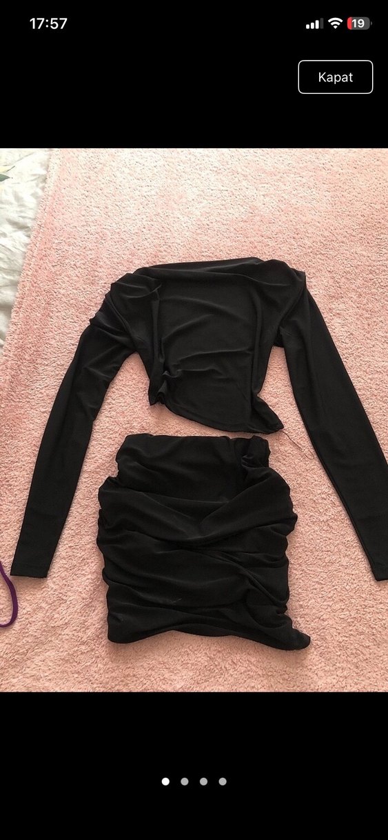 Uzun kollu asimetrik , tek renk siyah mini ikili takım, drapeli detaylı ve tekne yaka ile romantik akşamlar için uygun.