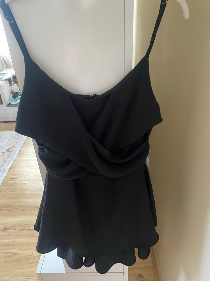 Siyah mini elbise, V yakalı ve kolsuz. Drapeli detaylarıyla fit bir kesime sahip, cesur ve Paris tarzı sokak giyimi havasında. Şortludur.