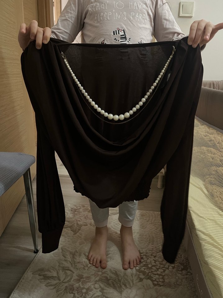 Siyah drapeli, uzun kolludur. Gevşek kesimi ve ipeksi dokusuyla gotik stile uygundur. Günlük kullanıma uygundur sırt dekoltelidir hiç kullanmadım