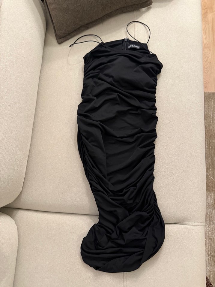 Bu siyah abiye elbise, straplez yakalı ve ince askılıdır. Drapeli tasarımı ve uzun boyuyla şık ve avant-garde bir görünüm sunar.