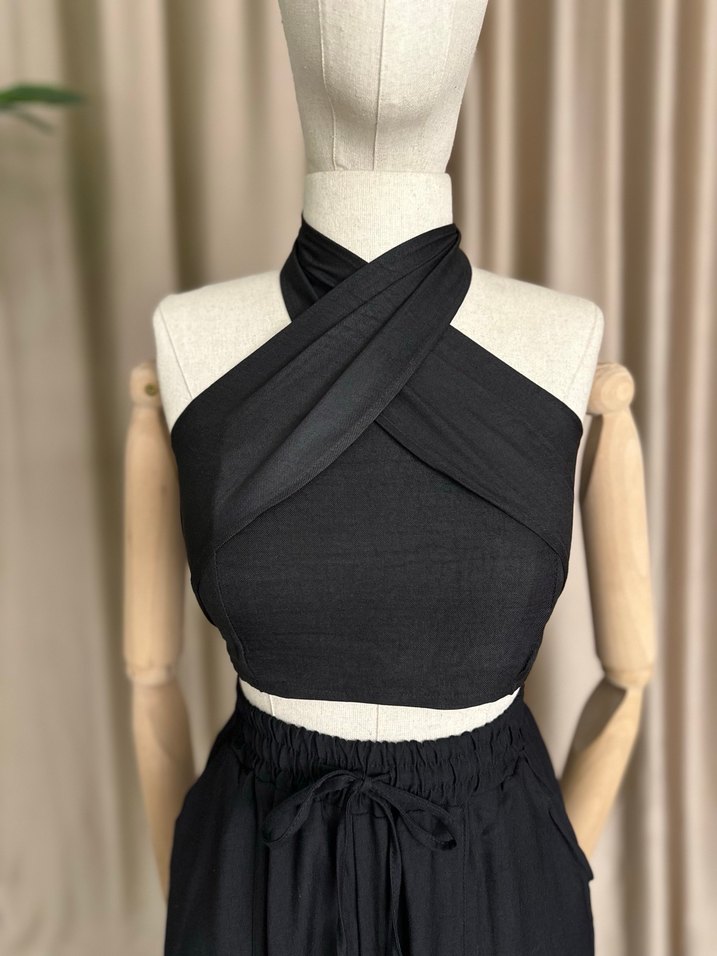 Siyah renkte, drapeli ve askılı detaylara sahip straplez crop top. Sentetik kumaştan, kısa ve regular kesim, günlük kullanıma uygun modern tasarım. 2 renkte de S-M-L bedenleri mevcut.