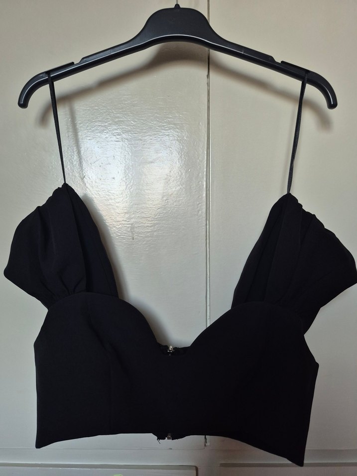 Sentetik kumaştan yapılmış, ince askılı, drapeli detaylı siyah midi bustiyer. Gotik tarzda romantik akşamlar için uygun.