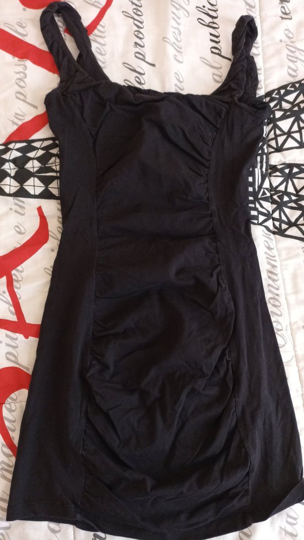 Siyah, straplez ve drapeli detaylara sahip, vücuda oturan midi uzunlukta elbise. Kolsuz ve desensiz, gotik parti tarzına uygun şık tasarım.