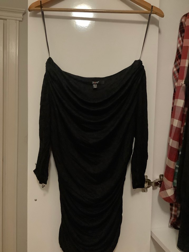 İnce askılı ve straplez yakalı, drapeli siyah midi elbise, gotik tarzıyla romantik akşamlar için uygun.