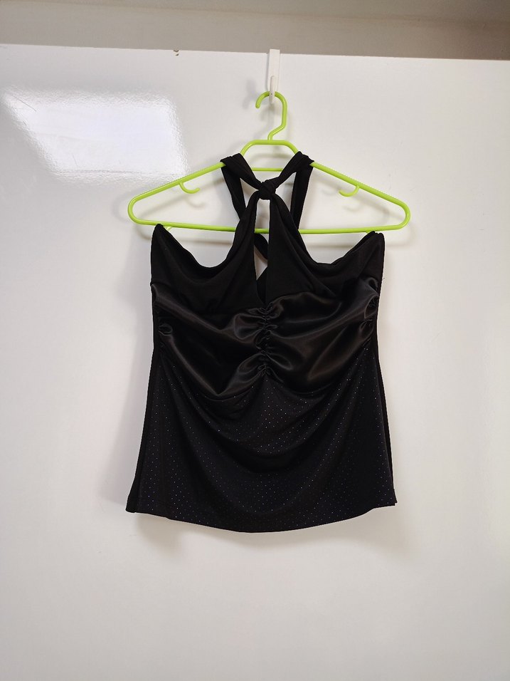 Siyah, straplez, drapeli ve kısa kesim atlet. Sentetik, parlak kumaştan, vücuda oturan kesimle tasarlanmıştır. Goth tarzı için uygundur.