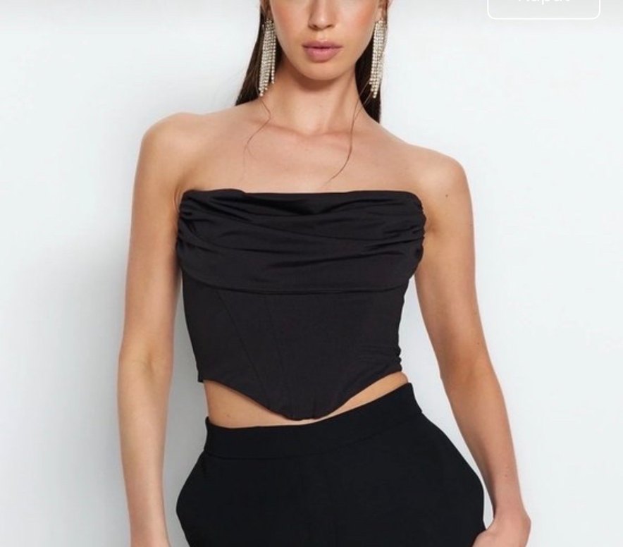 Siyah, straplez, drapeli ve mini uzunlukta bu fitted büstiyer, parlak ve gösterişli bir sokak stili sunar. Parti için ideal, kolsuz tasarım.