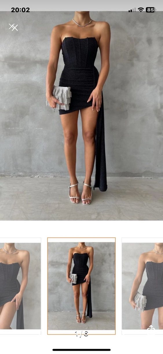 Siyah, straplez mini elbise, drapeli detaylı ve vücuda oturan kesimde, parlak sentetik kumaştan üretilmiştir. Etiketli ve yenidir, kalıbı esnek ve likralıdır. ölçüleri görselere ekledim. boyu 70 cm. gögüs pedi yok. parıltılı ışıl ışıl mini gece elbisesi. #geceelbisesi#abiye#düğün#nişan#davet#parti #düğün #elbise #siyah