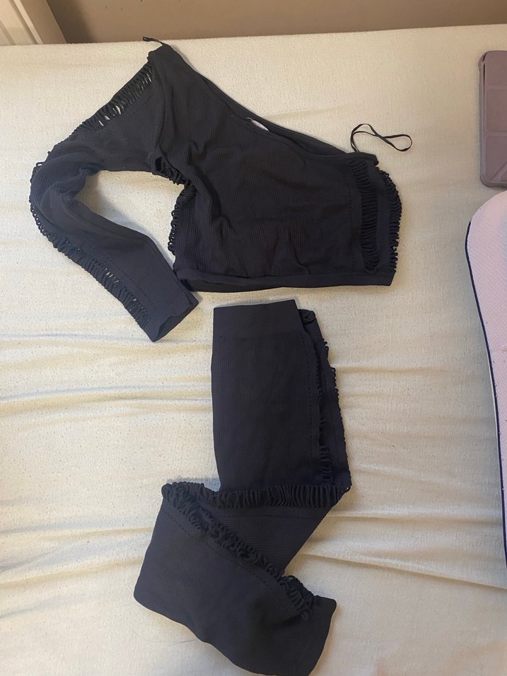 Siyah, straplez ve drapeli tek kollu üst ile uyumlu tayttan oluşan, vücuda oturan ve sentetik kumaştan yapılmış gotik tarzda takım. Xs-s beden uyumlu