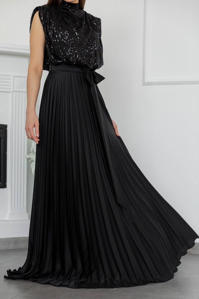 Uzun siyah abiye elbise, straplez yaka ve drapeli detaylara sahiptir. Dar kesim, askılı kol ve gotik tarzıyla düğünler için uygundur.