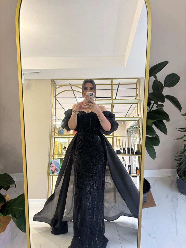 Siyah renkli, straplez yakalı ve drapeli detaylara sahip uzun abiye elbise. Desenli kumaşı ve klasik şıklığıyla düğünlerde tercih edilebilir. kolları isteğe göre çıkarabilirsiniz yeni bir kez giyildi
