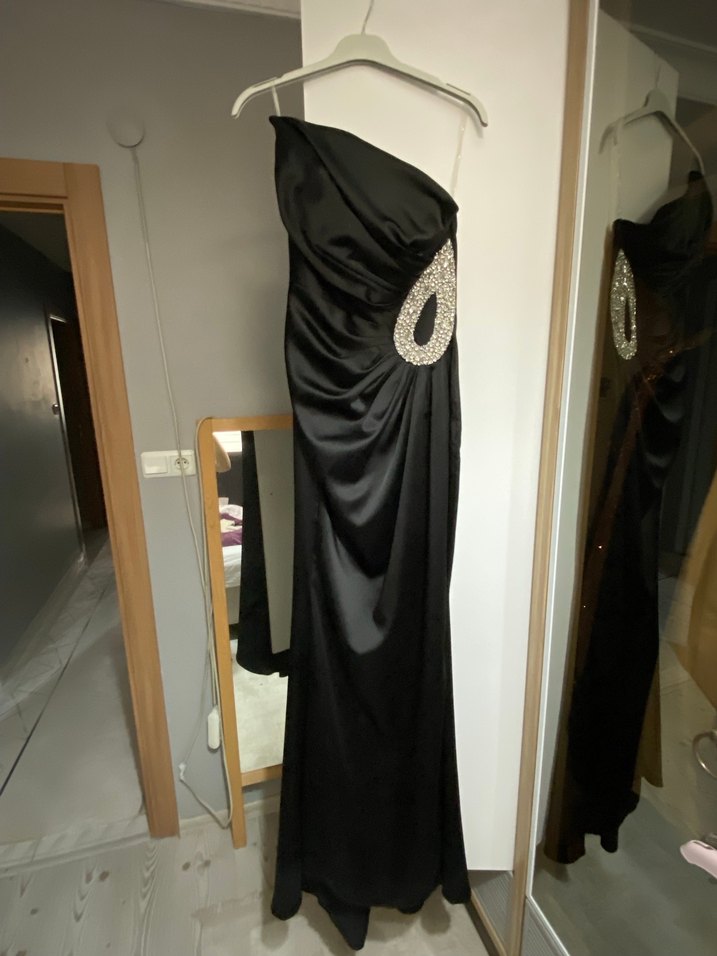Siyah, straplez uzun abiye elbise, drapeli detaylara ve belde parlak süslemeye sahiptir. Düğün ve özel davetler için uygundur.