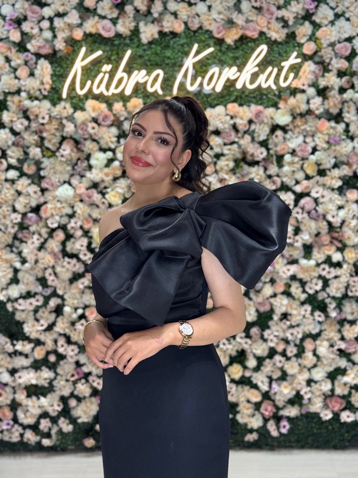 Bu siyah, straplez ve drapeli uzun abiye elbise, çiçek desenleriyle klasik ve modern şıklığı bir araya getirir. Düğünler için uygundur.