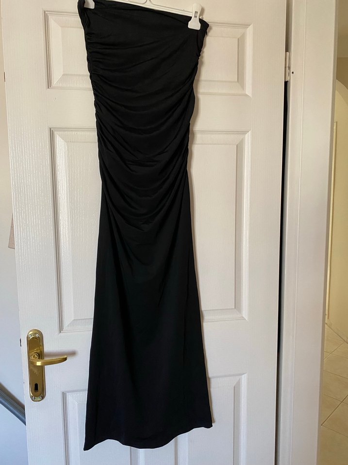 Siyah, straplez yakalı ve drapeli tasarımlı,elastan kumaştan yapılmış uzun ve vücuda oturan elbise. Gotik tarzı ve ince askılarıyla romantik akşamlar için ideal.