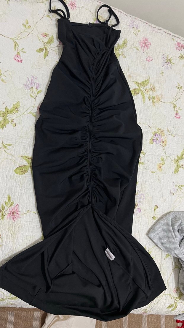 Siyah, straplez ve drapeli tasarıma sahip, sentetik kumaştan üretilmiş, vücuda oturan kolsuz uzun elbisedir. Gotik ve avangart tarzı yansıtır.
