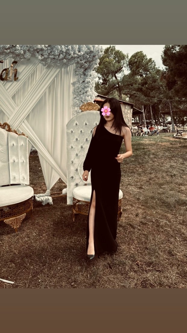 Siyah, ince askılı, drapeli ve straplez yakalı uzun elbise. İnce kesimi ve yırtmaç detayıyla partiler için uygun.