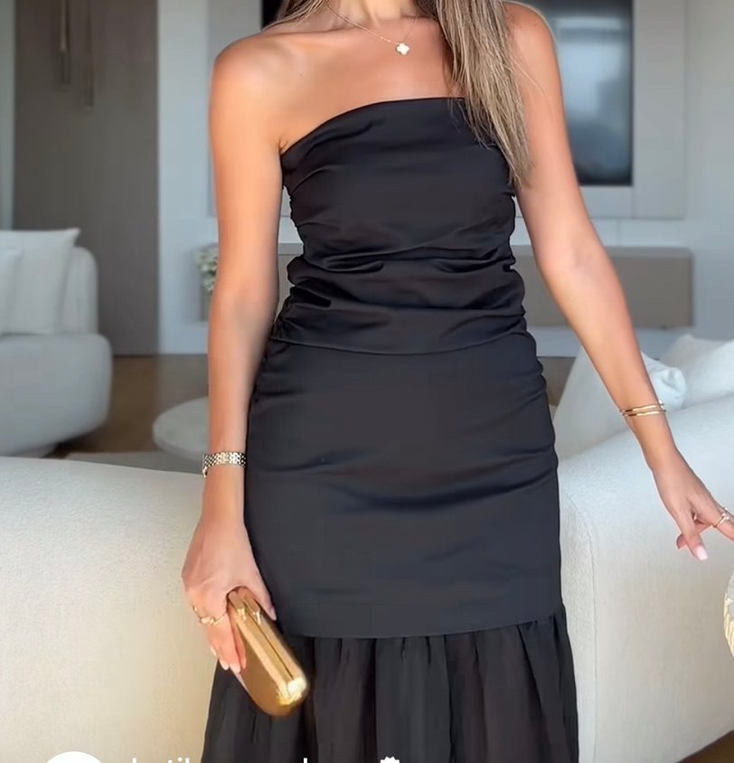 Sadece bir kere giyilmistir. Siyah, straplez yakalı ve drapeli detaylı, ince askılı uzun elbise. İpeksi kumaşıyla şık ve iddialı, romantik akşamlar için uygun.