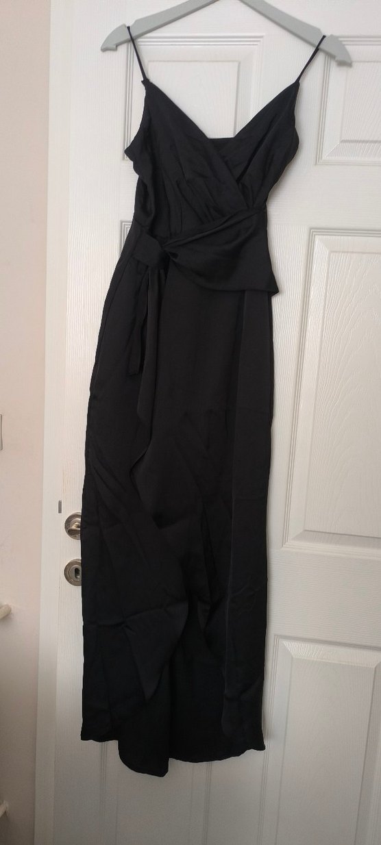 Siyah, straplez, drapeli ve satenimsi kumaştan yapılmış, vücuda oturan ve kolsuz uzun elbisedir. Gotik ve modern tarzı yansıtır, ofis kullanımı için uygundur. hiçbir kusuru yoktur sayılı giyildi