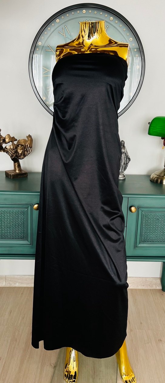 Siyah, straplez uzun elbise, drapeli tasarımı ve ipeksi kumaşıyla dikkat çeker. Regular fit ve kolsuz yapısı ofis için uygun, gotik tarzda şık bir seçimdir.