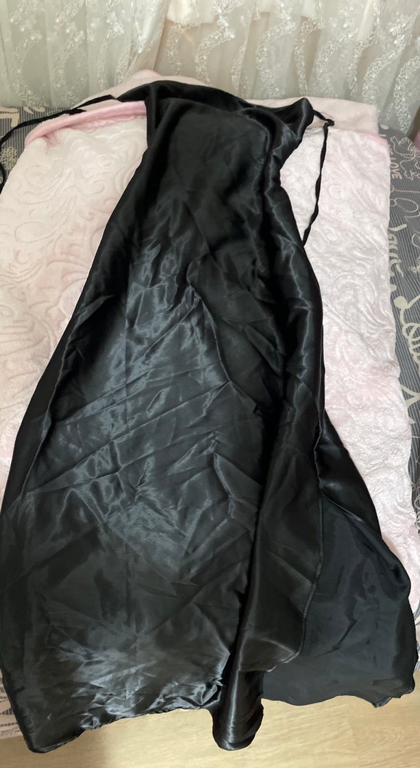 Bu siyah elbise, straplez yaka, ince askılar ve drapeli detaylarla romantik bir gece için gotik tarz sunar.