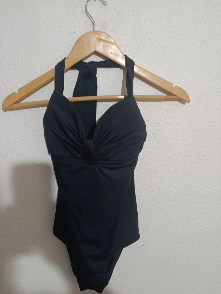 Fitted kesim, siyah drapeli strappy kollu mayo. Midi boyda, minimalist ve goth tarzda, plaj için uygun.