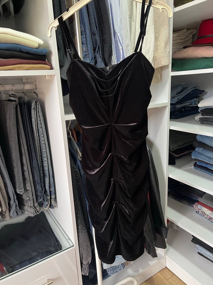 Siyah, straplez yaka ve ince askılı, drapeli tasarıma sahip oturan midi boy abiye elbise. Koyu gotik tarzıyla partiler için cesur bir seçim. Çok güzel bir kere bile giyemedim.
