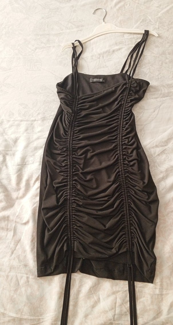 Siyah, drapeli detaylı, askılı kısa midi elbise. Straplez yaka ve gotik tarzıyla romantik akşamlar için uygun.